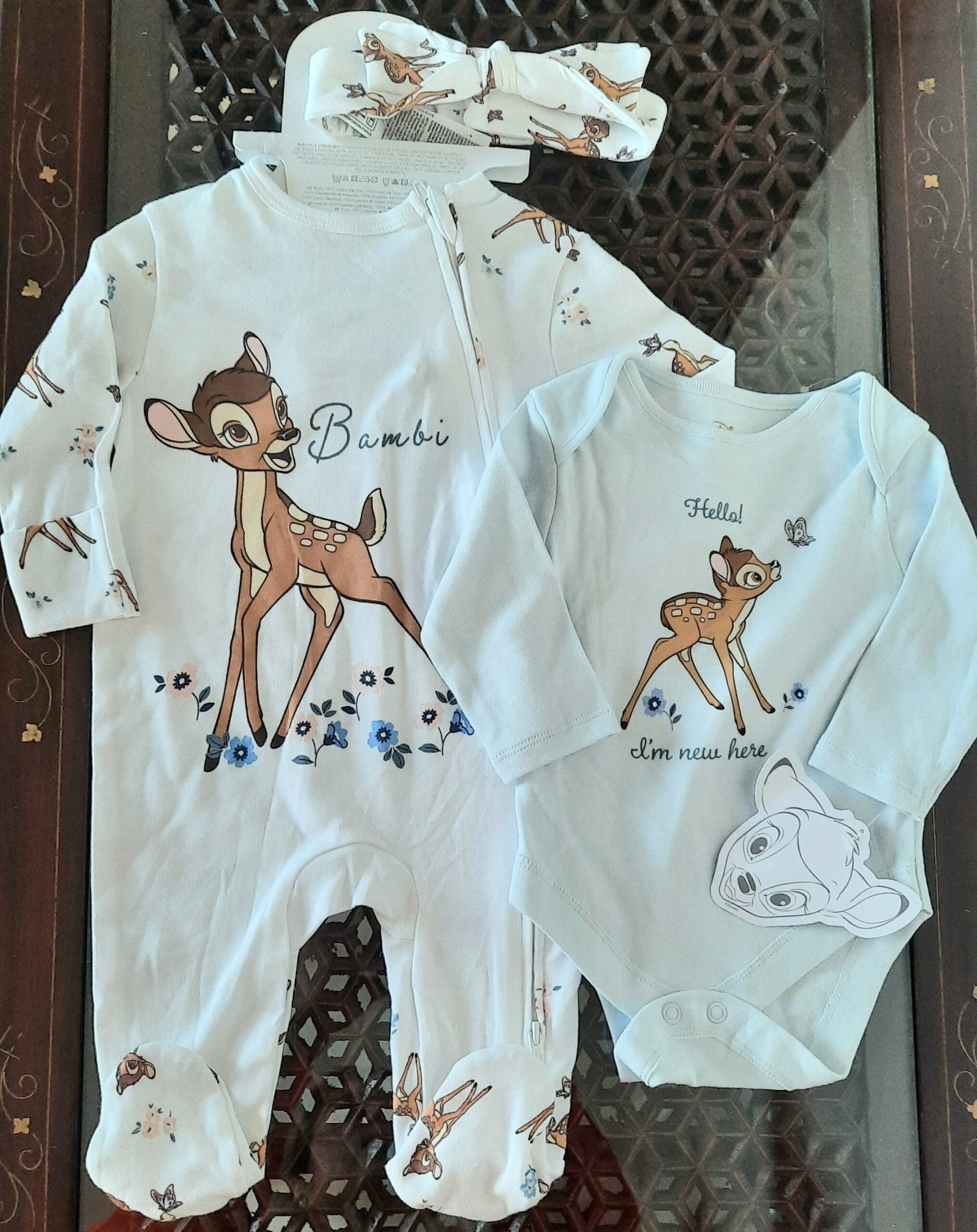 A newborn baby Disney clothing set, including a sleepsuit, bodysuit and headband.