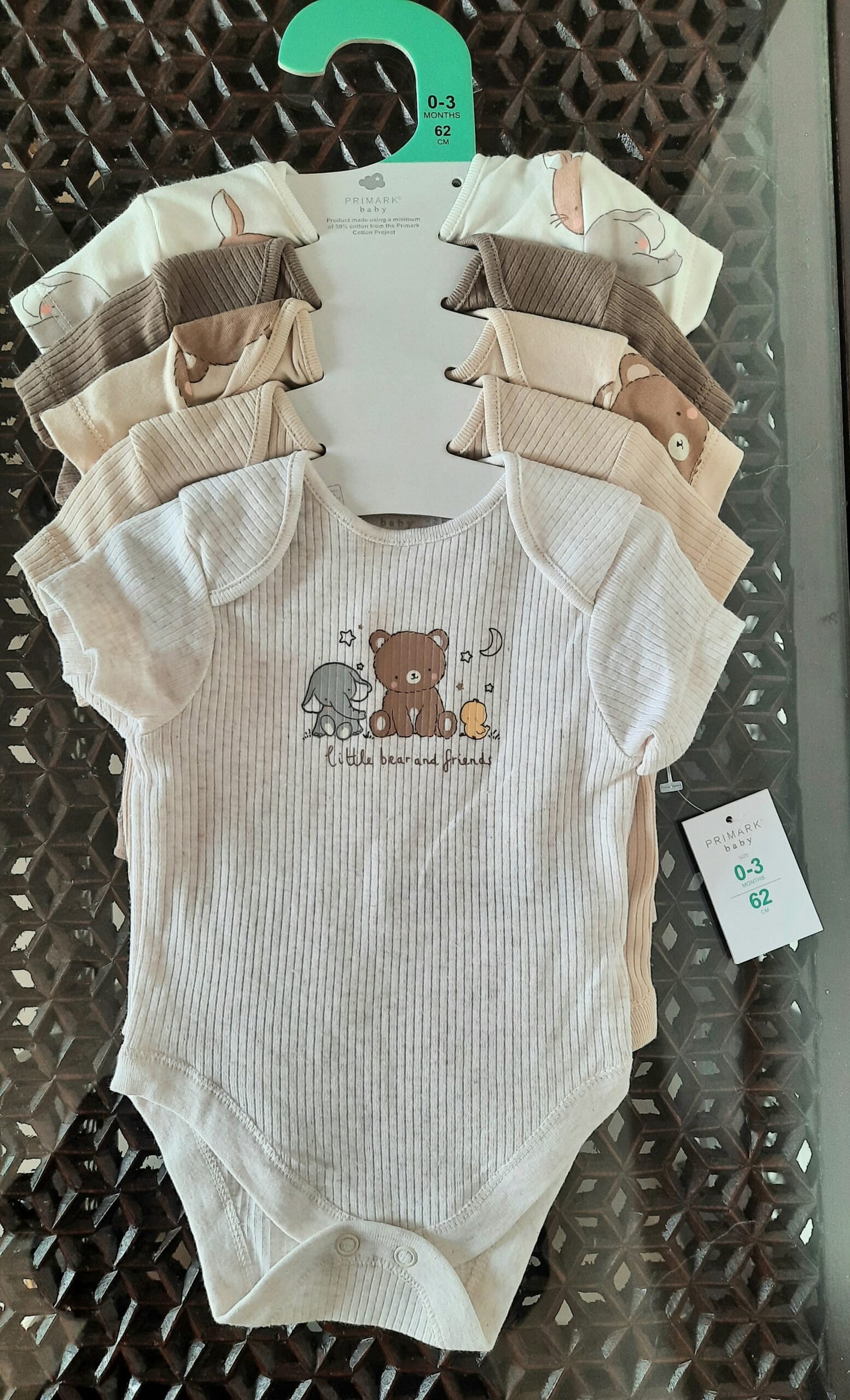 A set of five bodysuits with mixed patterns, ribbed brown style, soft neutral tones, and sweet repeating patterns with bears, rabbits, and elephants. The colours are soft and earthy, with tones like cream, beige, and brown for easy mix-and-match outfits. Popper fastenings at the bottom make changes quick , and the soft cotton-rich fabric keeps things comfy all day long. An easy win for daily dressing with a dash of charm.