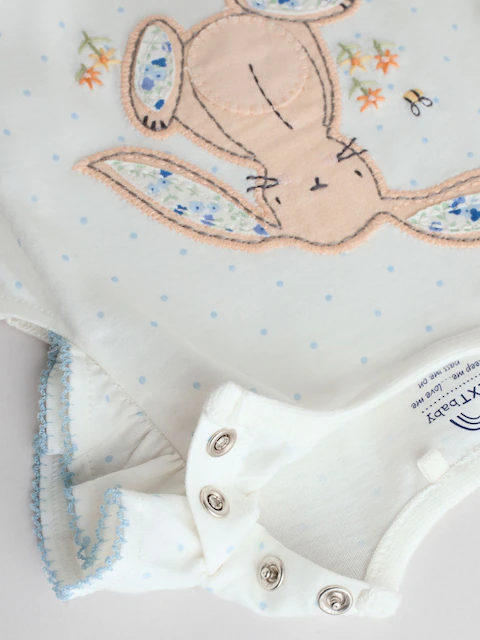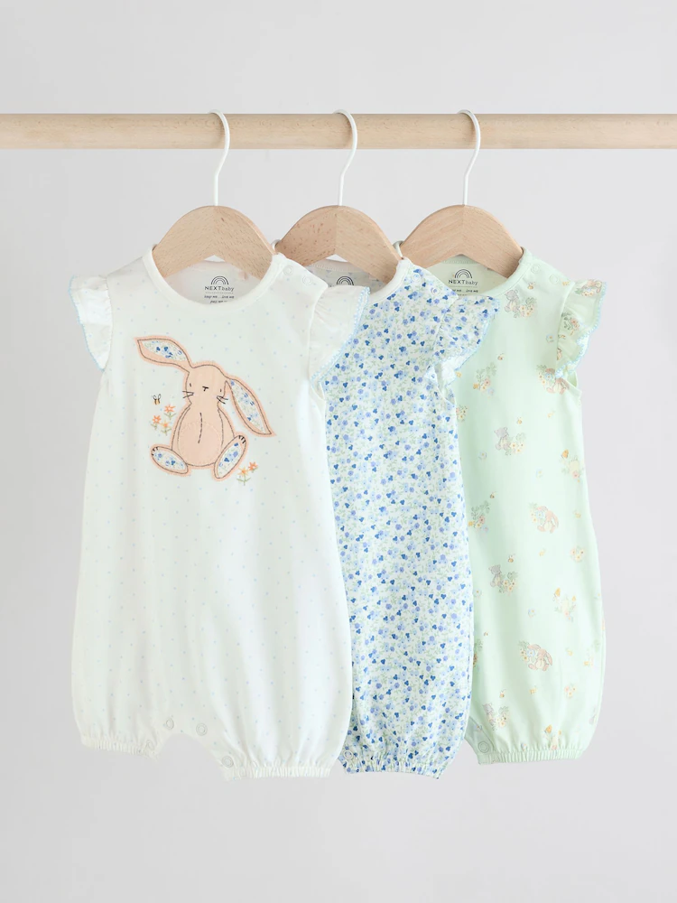 Blue Bunny Embroidered 3 Pack Frill Shoulder Baby Rompers