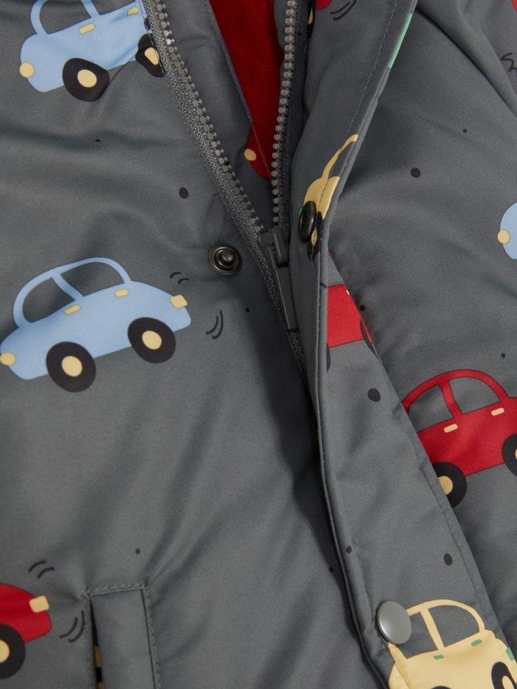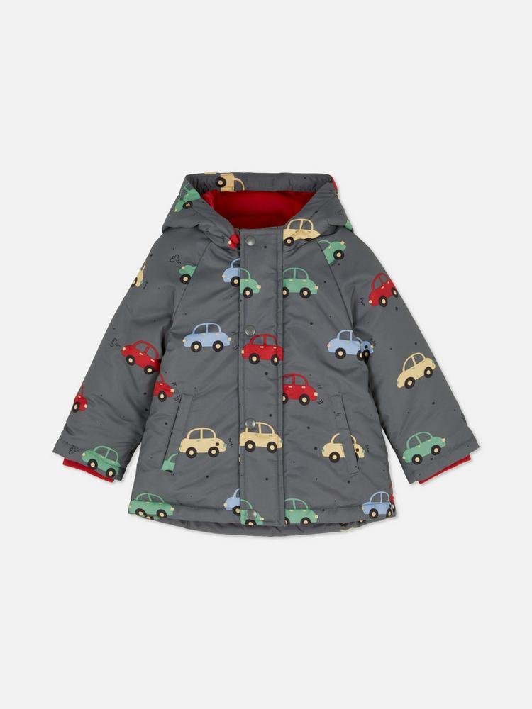 A padded puffer jacket( velour lined) with a concealed front fastening, slip pockets and an all-over car graphic design.