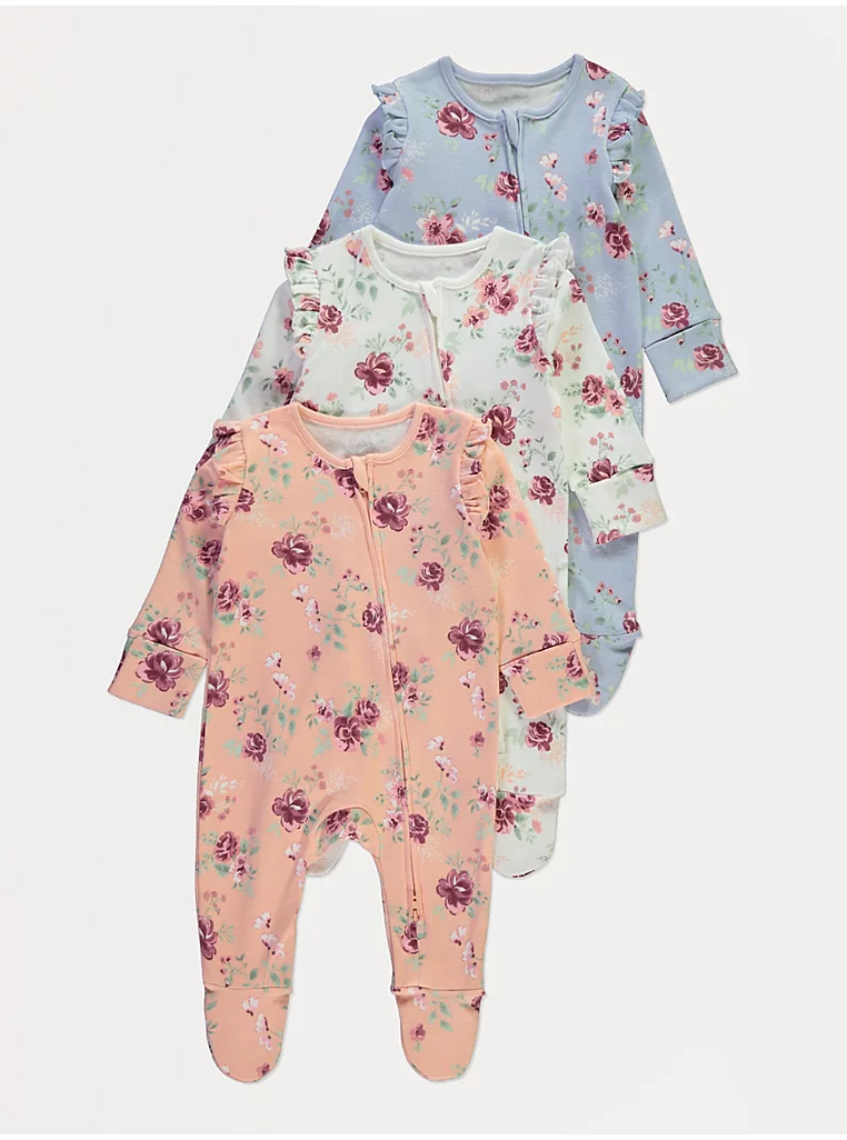 Floral Frill Shoulder Zip Fasten Sleepsuits 3 Pack