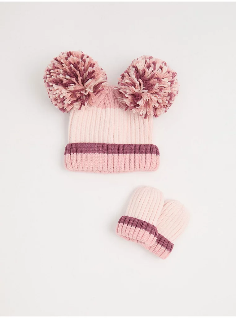 Pink Stripe Knitted Bobble Hat and Mittens Set (6-12 months)