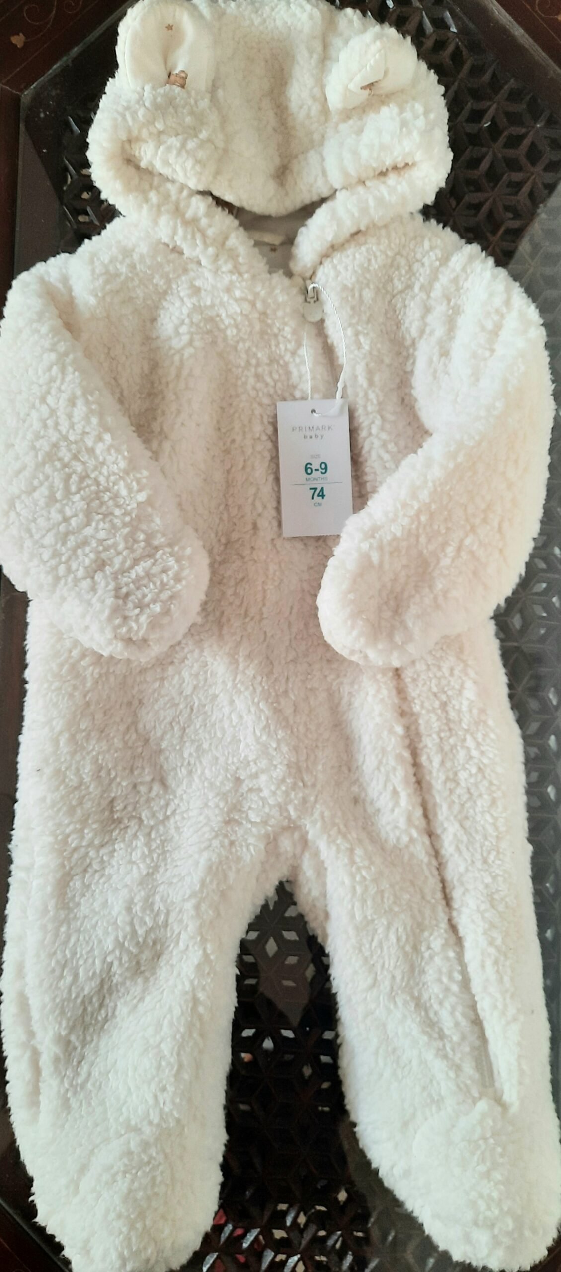 A pramsuit with hood ears in a borg fabric with a zip front. Made from soft teddy-style fabric in a neutral cream shade, it’s designed with full-length sleeves and legs to keep baby snug from head to toe. The hood is finished with sweet little ears for an extra-cute touch, while the zip front makes dressing fuss-free. Perfect for pram naps and outdoor strolls.